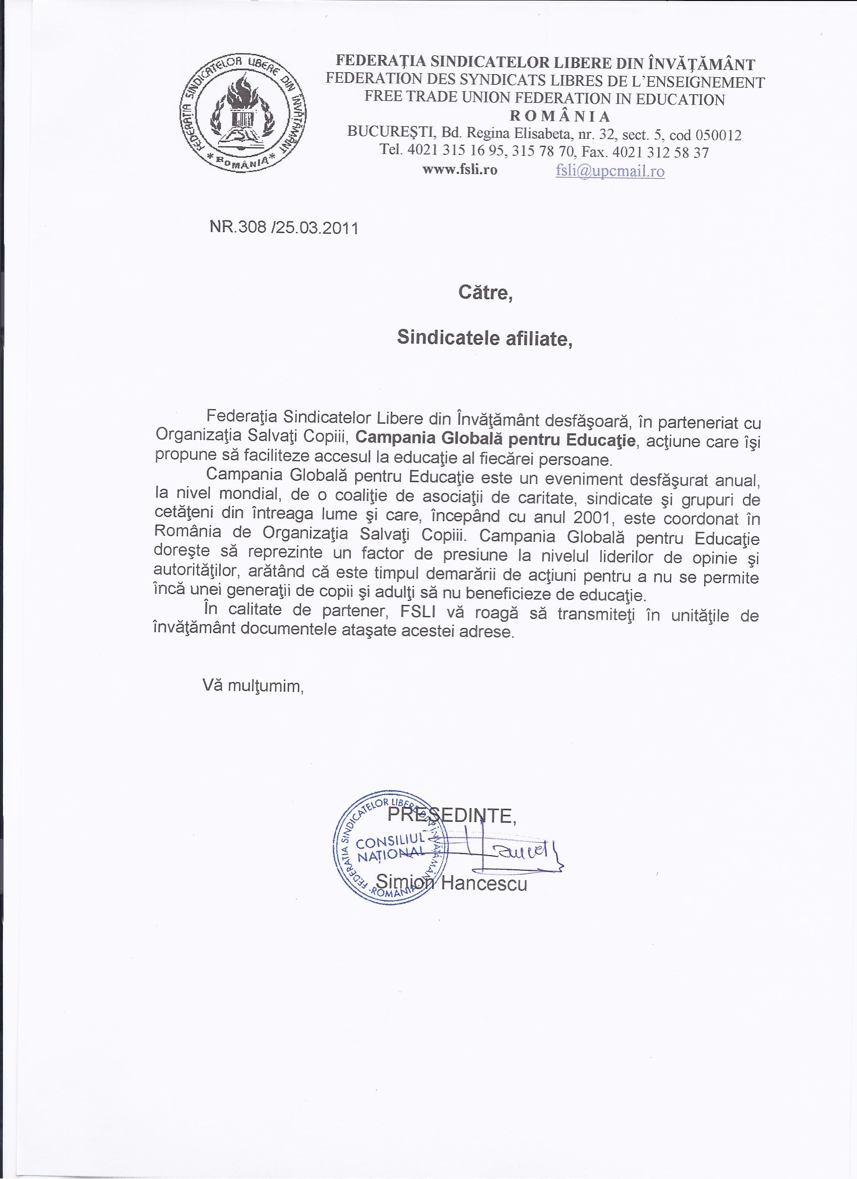 F.S.L.I. desfasoara, in parteneriat cu Organizatia Salvati Copiii, Campania Globala pentru Educatie, actiune care isi propune sa faciliteze accesul la educatie al fiecarei persoane.